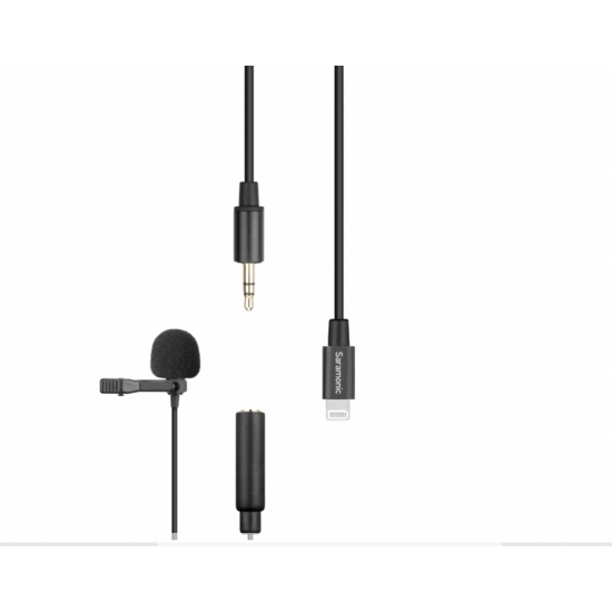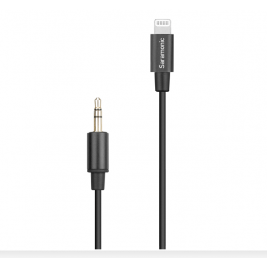 Se compone de dos partes, un cable TRS macho de 3,5 mm a adaptador Lightning y un micrófono lavalier con un conector hembra de 3,5 mm. Este diseño también le permite conectar cualquier dispositivo de audio con una salida TRS de 3.5 mm a su iPhone o iPad, como el Saramonic UwMic9 RX9, Vmic Mini, SR-PMIC1 y más.