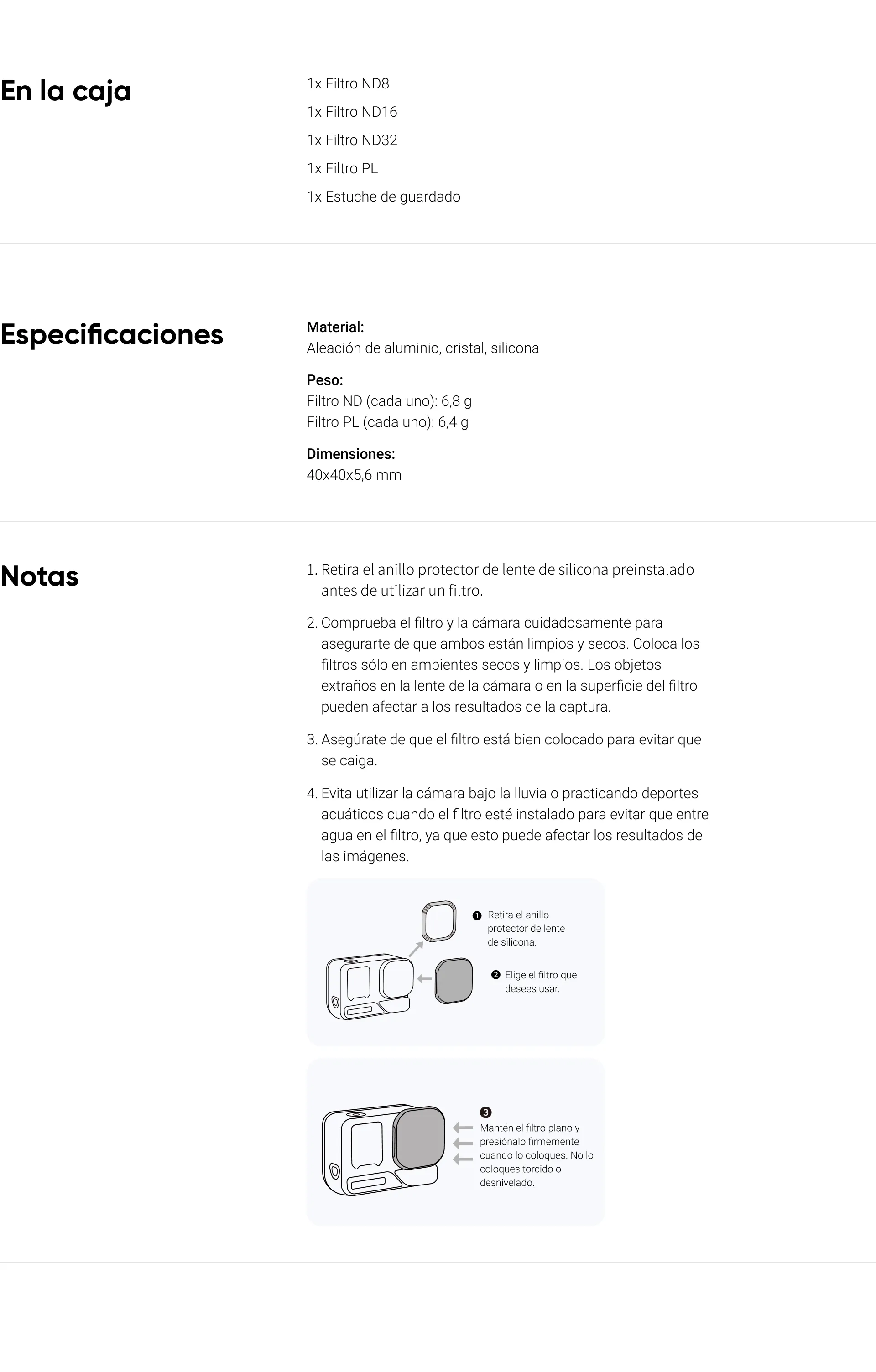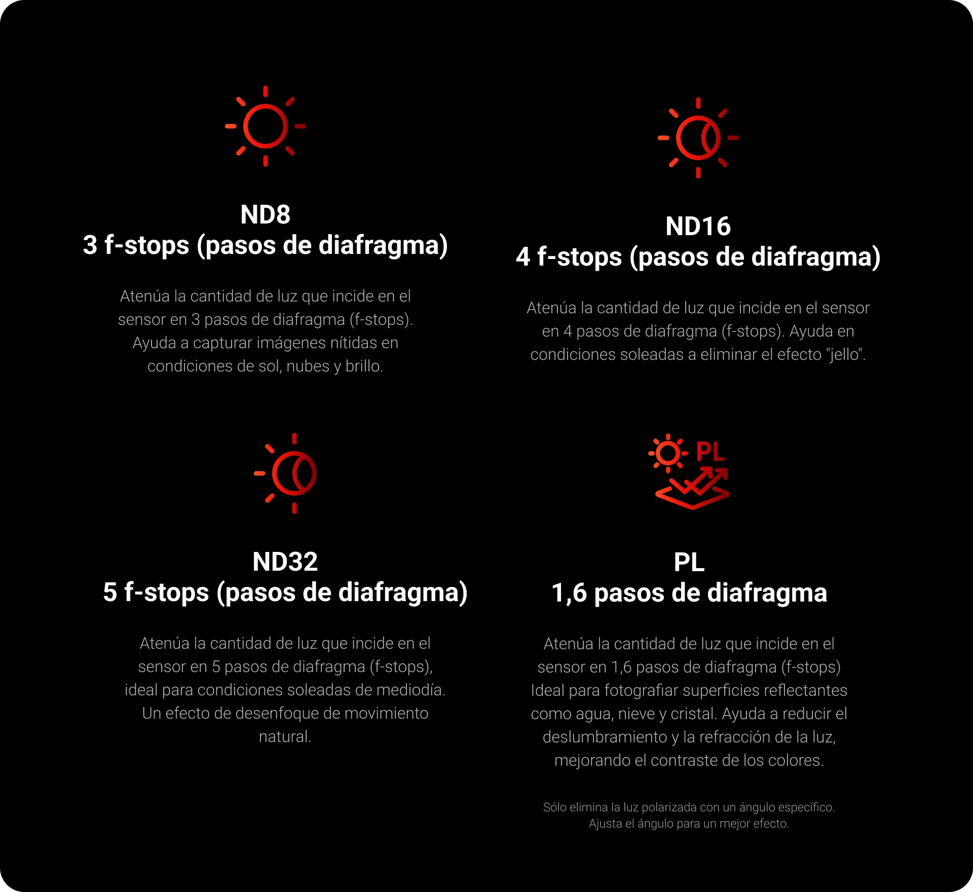 • Incluye filtros ND8, ND16, ND32 y PL para diferentes niveles de atenuación de luz.